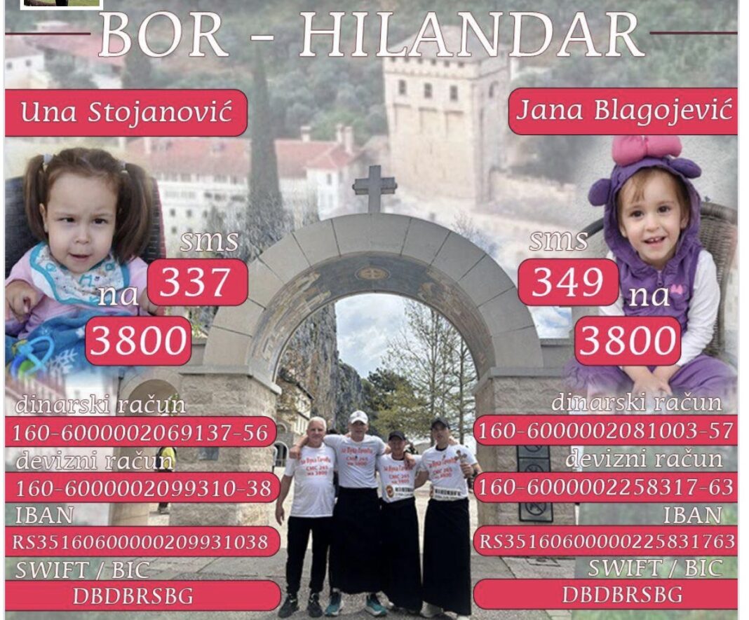 Nakon što su trojica Borana Srđan Anđelković, Nenad Stefanović i Matija Nikolić trčali do Ostroga kako bi prikupili novčanu pomoć za lečenje Vuka Gačića, sada spremaju novu humanitarnu akciju. Ovog puta, oni će trčati od Bora do Hilandara za dve male hrabre devojčice Unu Stojanović i Janu Blagojević.